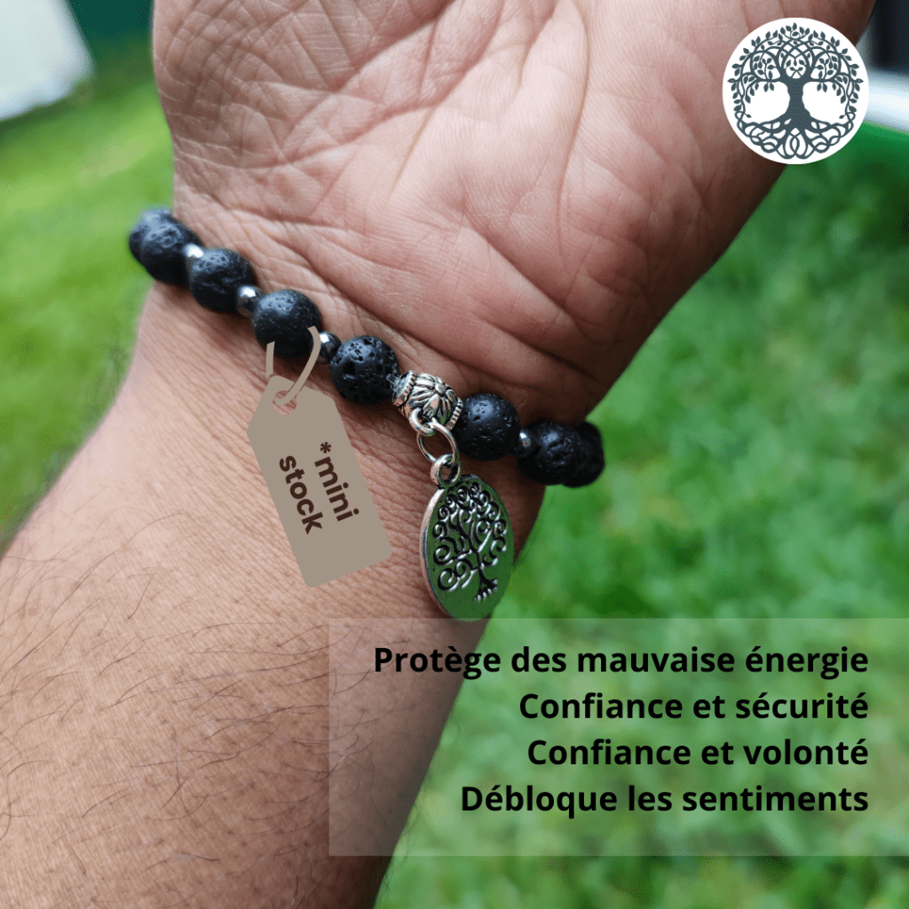 Le bracelet arbre de vie est constitué de 2 pierres puissantes: la Pierre de Lave Volcanique & l’hématite.