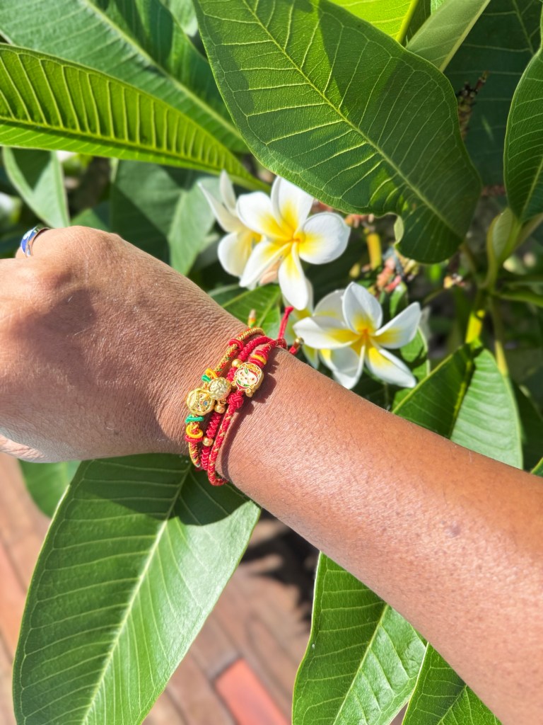 Dans la tradition hindoue, le Mauli: ce fil sacré est attaché au poignet comme un sceau de bénédiction. Il agit comme un gardien énergétique, protégeant son porteur tout en attirant les énergies favorables. En Thaïlande, cette intention se retrouve à travers des rituels similaires, où les bracelets bénis deviennent des porte-bonheur puissants, liés à la foi, à la spiritualité et aux esprits protecteurs.