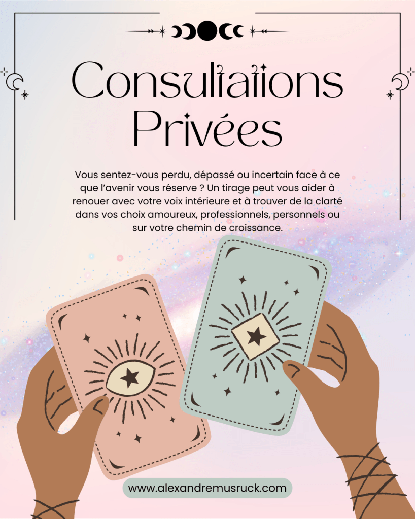 Vous avez la possibilité de réserver une session privée par téléphone avec moi du lundi au vendredi, de 11h à 18h, selon le fuseau horaire de l’océan Indien. J’utilise divers outils divinatoires tels que le Petit Lenormand, les cartes à jouer, les cartes Kipper, l’oracle des Anges ou le tarot, ainsi que d’autres techniques de divination pour vous guider sur votre chemin. Vous pouvez choisir une consultation de 30 ou de 60 minutes. Une fois votre paiement effectué, veuillez envoyer un e-mail à alexandremusruck@gmail.com pour fixer votre rendez-vous. En raison du nombre croissant de demandes, le délai d’attente actuel pour obtenir un tirage est de 15 à 20 jours (hors weekend & jour ferrier). Si vous avez besoin d’une consultation en urgence dans les 48 heures, veuillez consulter ce lien ICI