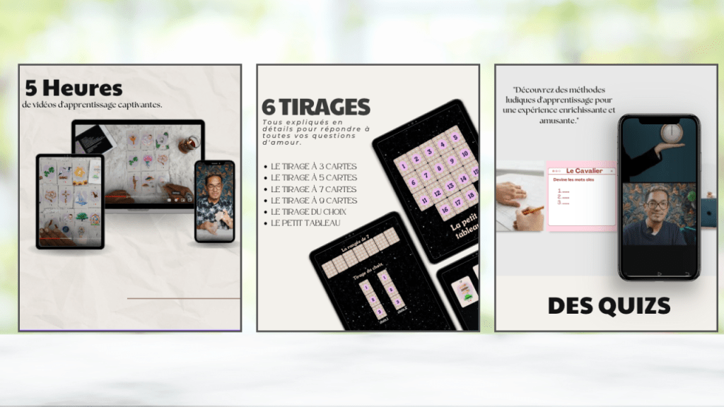Le cours en ligne en vidéo vous permet d’avoir les outils nécessaires pour un bon apprentissage, une compréhension claire et une meilleure assimilation de l’art du petit lenormand. Le cours en ligne vous permettra d’avoir les bas nécessaires pour aller plus loin dans votre apprentissage. Vous serez entrainé aux méthodes traditionnelles mais aussi aux modernes