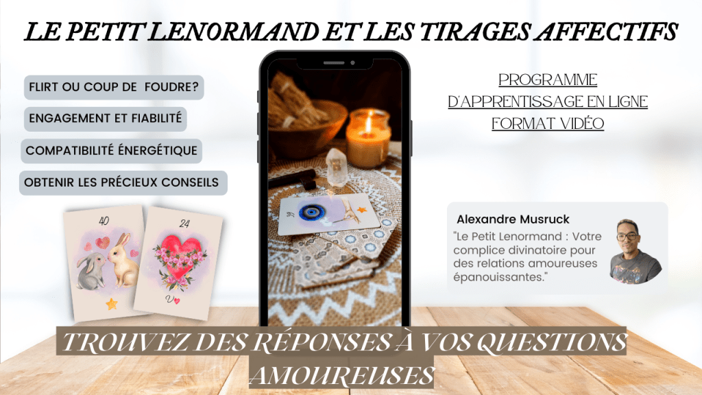 L’amour est souvent le sujet abordé lors d’une consultation, car l’être humain a besoin d’être rassuré sur des domaines qu’il ne peut contrôler, tels que l’amour et les relations humaines. Tout au long de ma longue carrière en tant que cartomancien, j’ai accueilli de nombreuses personnes à ma table de consultation, étudié et analysé différentes situations. J’ai réalisé que le Petit Lenormand, mon jeu divinatoire de prédilection, m’a permis de reconnaître des relations saines, durables et emplies d’amour, ainsi que celles où règnent la dépendance, le mensonge et la manipulation.