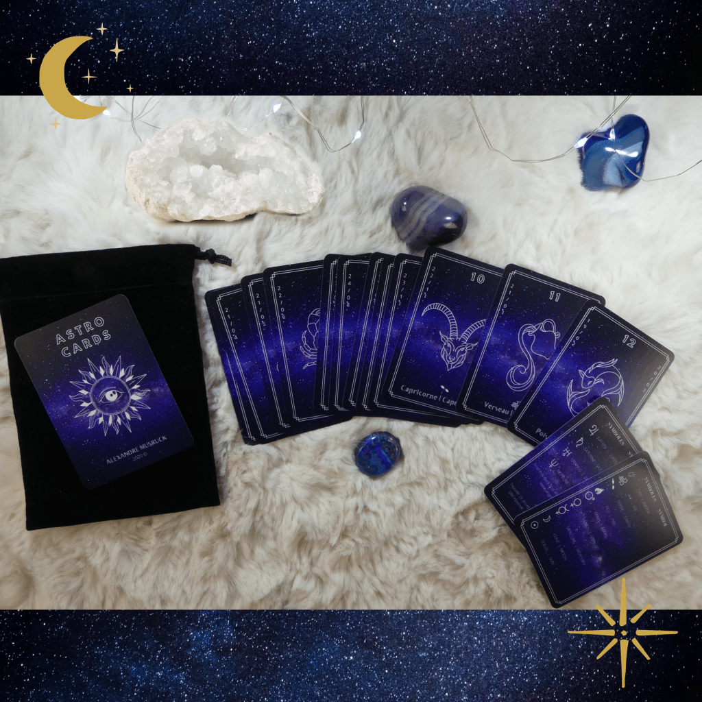 L’Astro deck est un petit jeu de 14 cartes qui illustre les 12 signes du zodiaque plus 2 cartes d’interprétation. Ce petit jeu est un complément pour mieux personnaliser vos tirages.